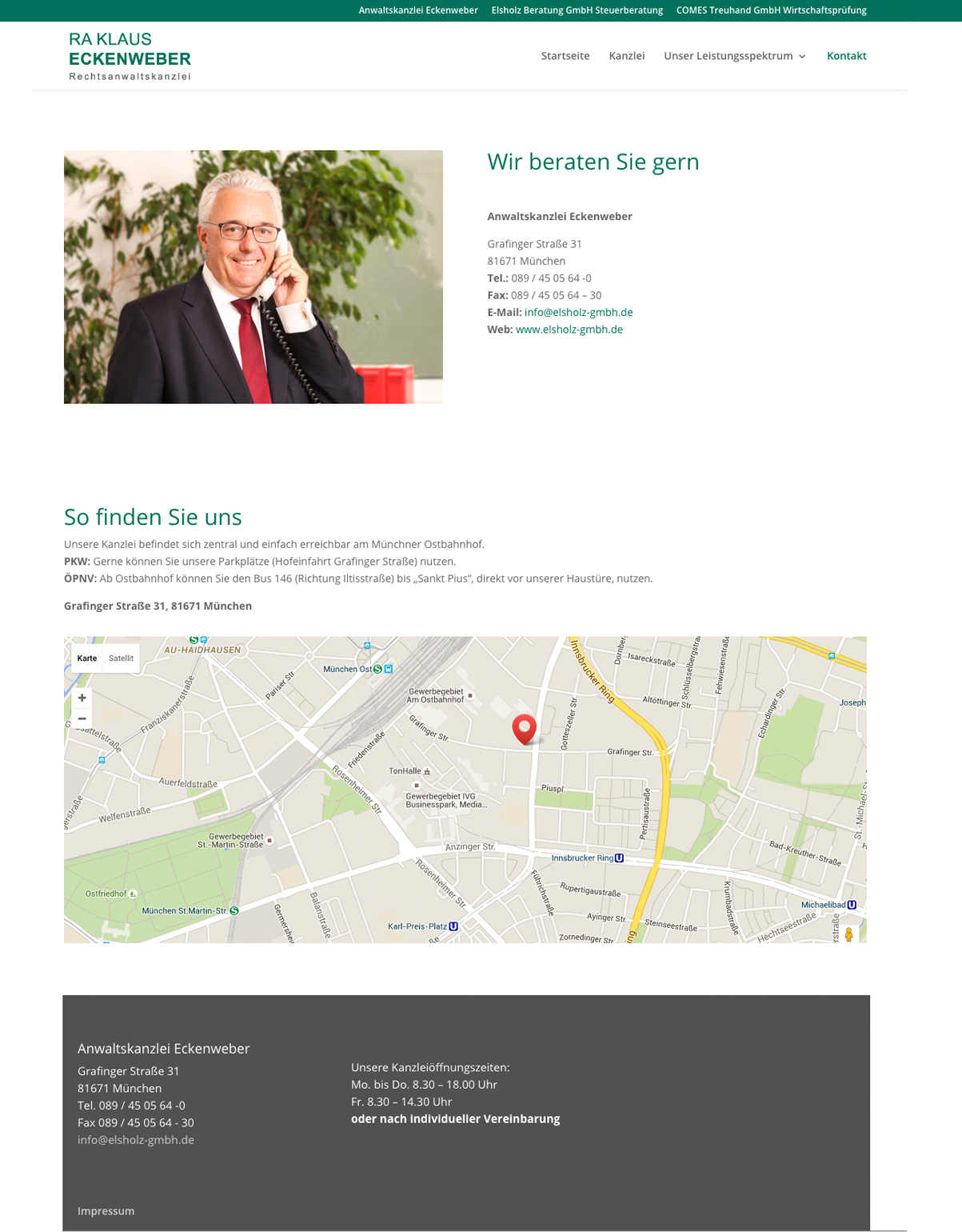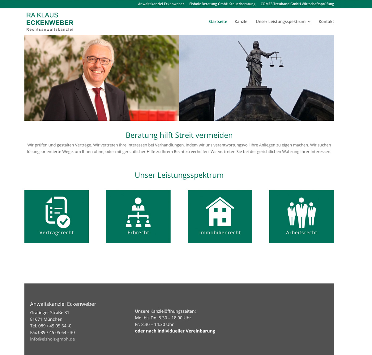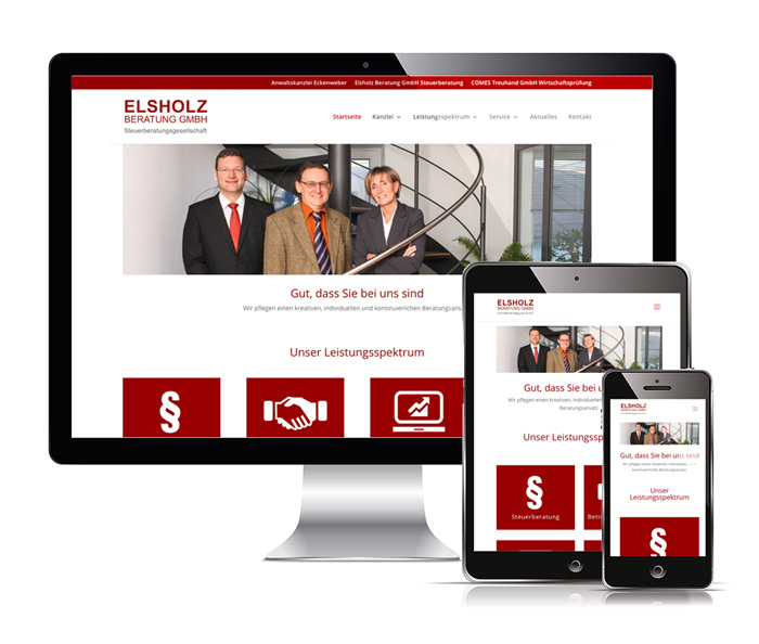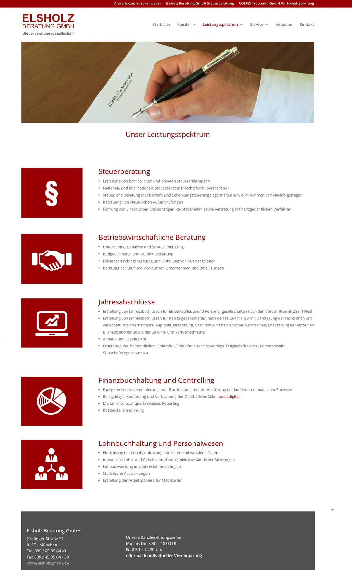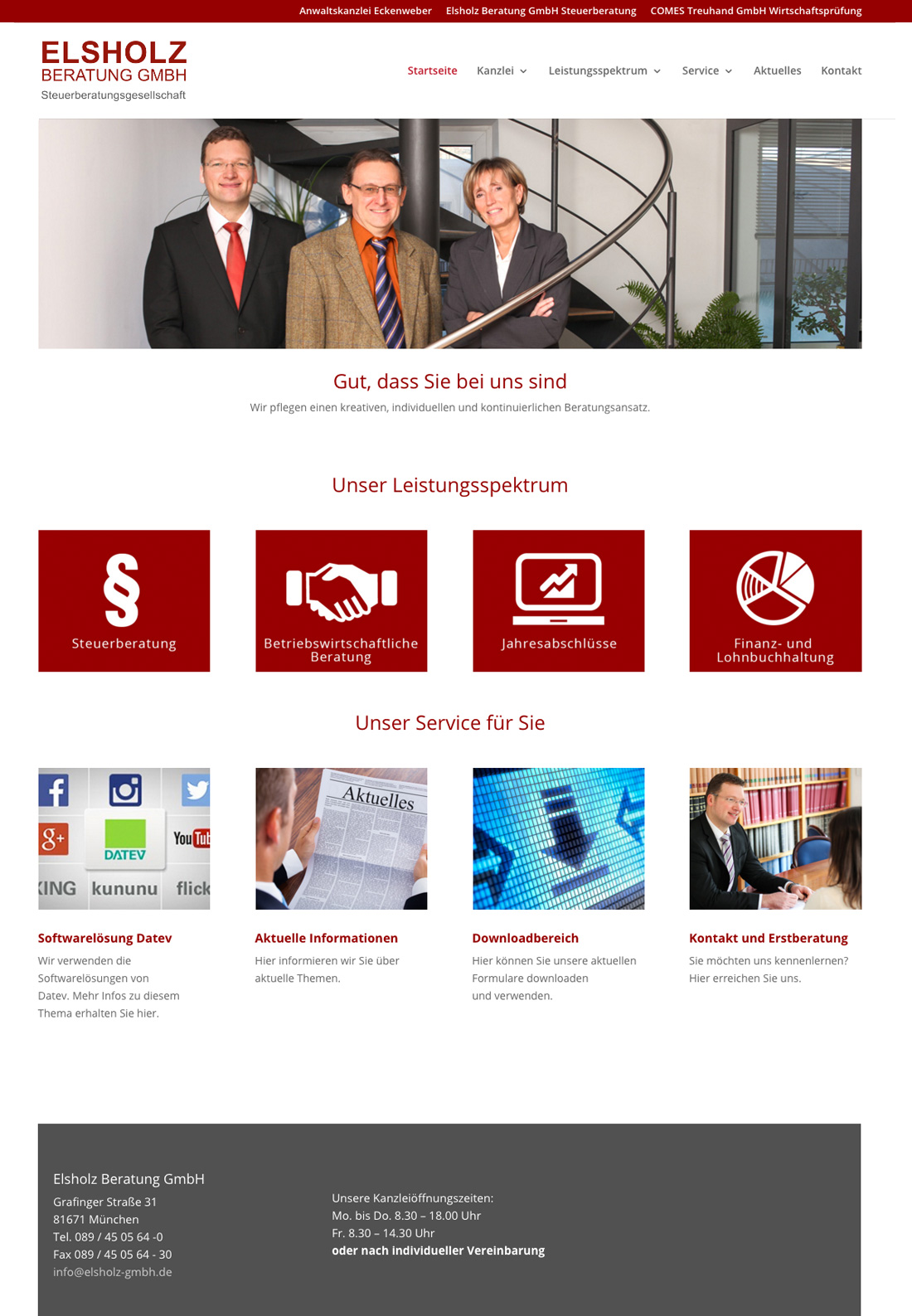 Unter dem Dach der Elsholz Beratung GmbH firmieren eine größere Steuerkanzlei, ein Anwalt und eine Wirtschaftsprüfungsgesellschaft. Aufgabe war es, die drei Bereiche zwar unter einem Dach zusammenzufassen, aber auch optisch zu trennen. Außerdem sollte die neue Website klar strukturiert sein, mit moderner Optik und Pictogrammen als Leitsystem.