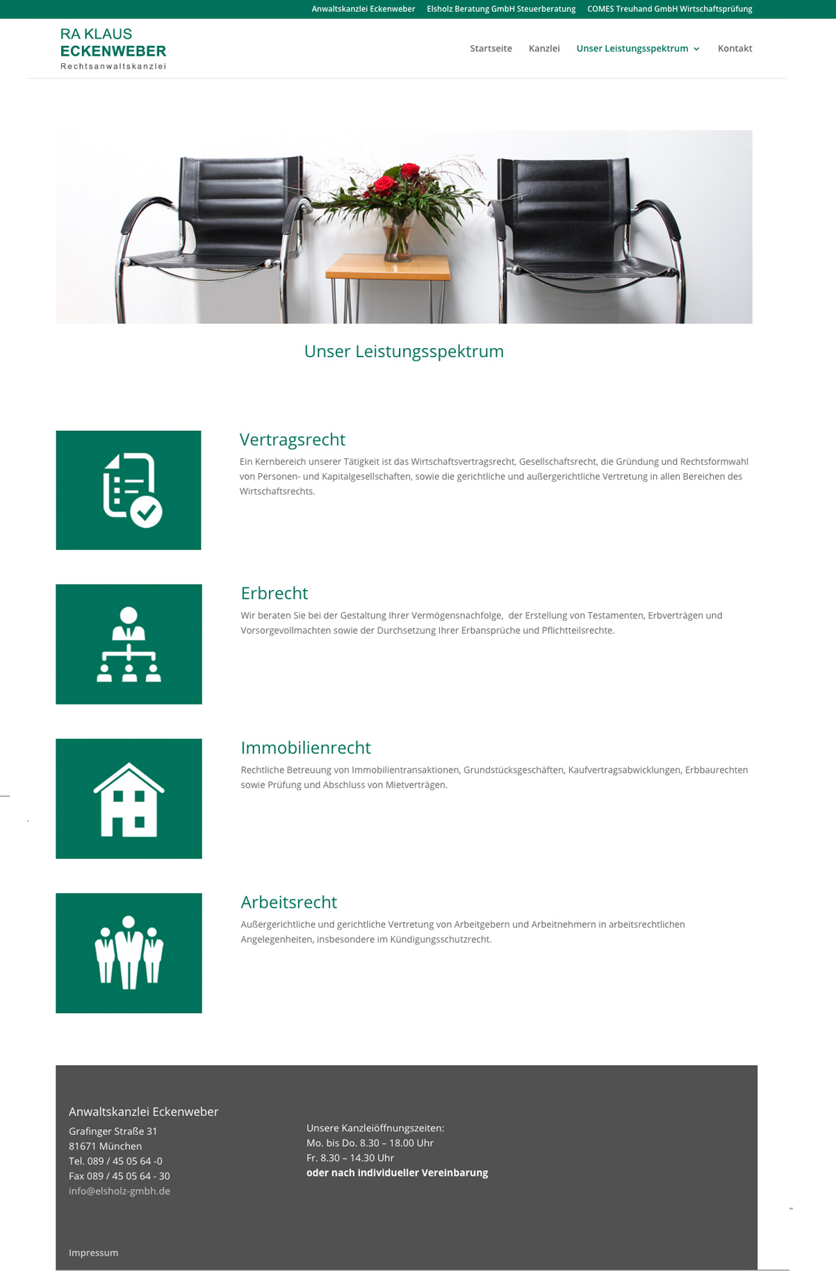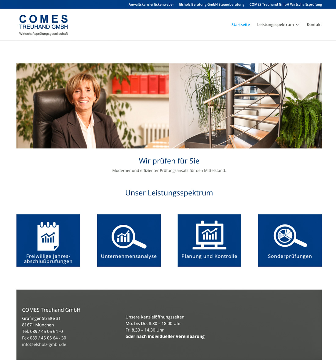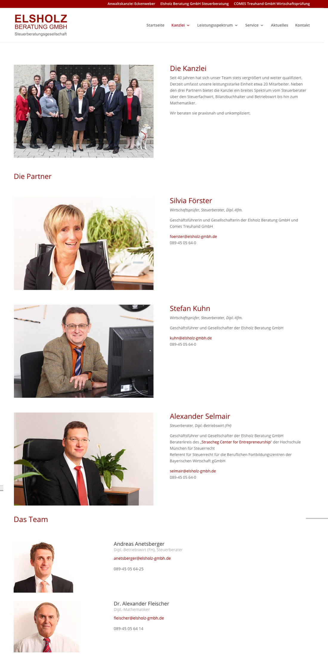 Die Domain www.elsholz-gmbh.de startet mit einer Dachseite und drei unterschiedlich farbigen, aber sonst strukturell gleich aufgebauten Unterdomains. Jeder Bereich hat seine eigene Farbe (Steuerkanzlei rot, Anwaltskanzlei grün, Wirtschaftsprüfung blau), die sich in den Headlines, Balken und den Icons zu den einzelnen Themenbereichen widerspiegelt. Über die Icons sind die Themenbereiche der Berufsgruppen leicht zu finden. Alle Portrait- und fast alle Stillife-Fotografien wurden von punktneun erstellt.